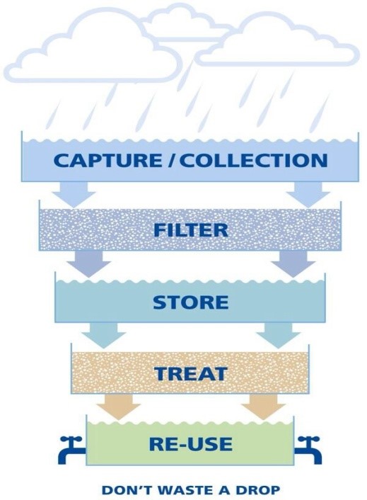 Zvody vedú vodu do nádrže. Často sa používajú špeciálne filtre alebo odlučovače na oddelenie prvých znečistených litrov vody (tzv. systém „first flush“).
